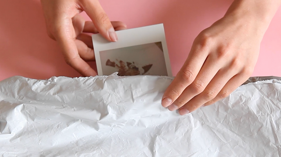 Description: Video documenting the story of a beige bag ordered online being unboxed and then eaten. The empty package is sent back with a Polaroid memento of the bag being eaten.